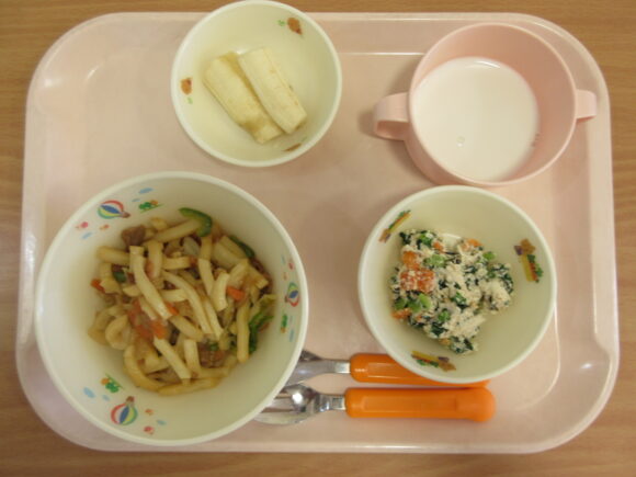 ・焼うどん・小松菜の白和え・バナナ・牛乳
