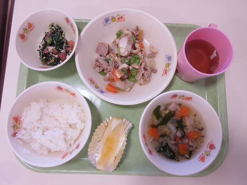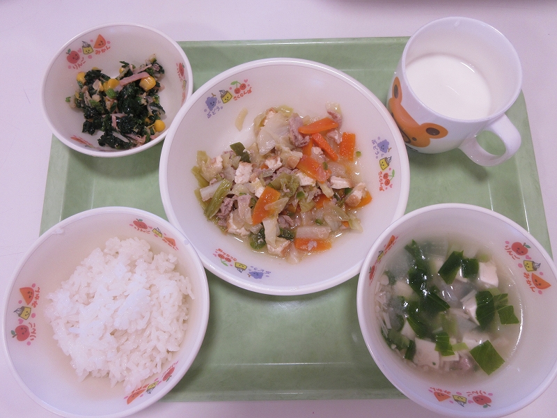 ごはん・豆腐スープ・豚肉とキャベツのみそ炒め・ほうれん草とトマトの和え物・牛乳