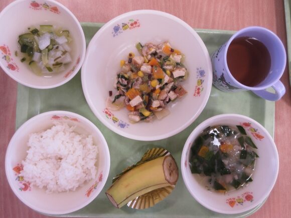 ☆ごはん・みそ汁・厚揚げの中華煮・きゅうりと長芋のさっぱり漬け・バナナ・麦茶