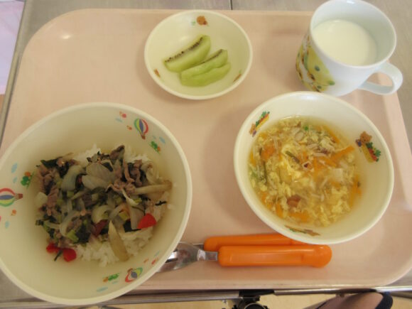 牛肉のみそ丼・かき玉汁・キウイフルーツ・牛乳