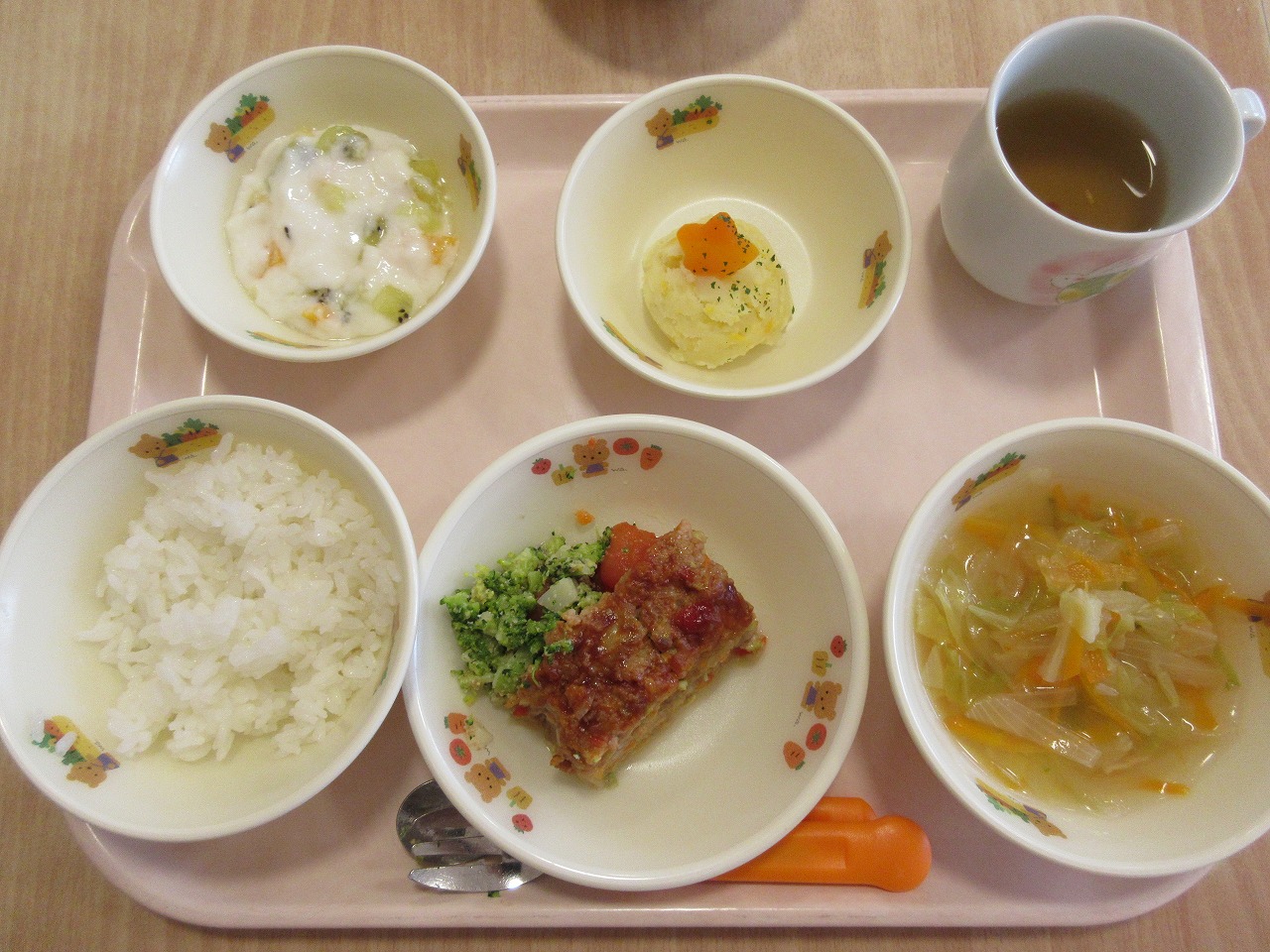 12月25日(木) 献立の紹介 2025.12.25 ・ご飯・コンソメスープ・ミートローフ(付け合わせ:ブロッコリー・焼きトマト)・ツリーポテト・ピーチムース・麦茶 ☆2歳児の提供量です☆今日も行事食でした✨