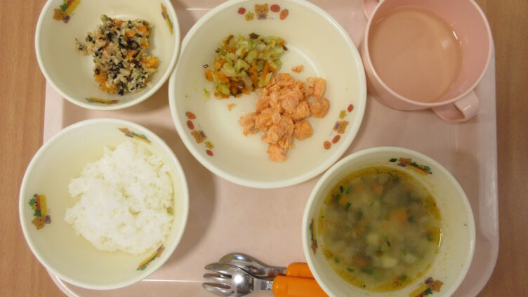 ・ご飯・けんちん汁・さけのみそ焼き(付け合わせ:キャベツ塩こんぶあえ)・バナナ・牛乳