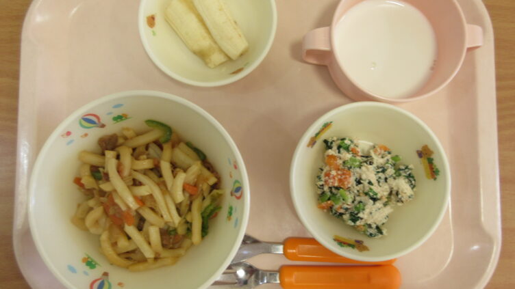 ・焼うどん・小松菜の白和え・バナナ・牛乳