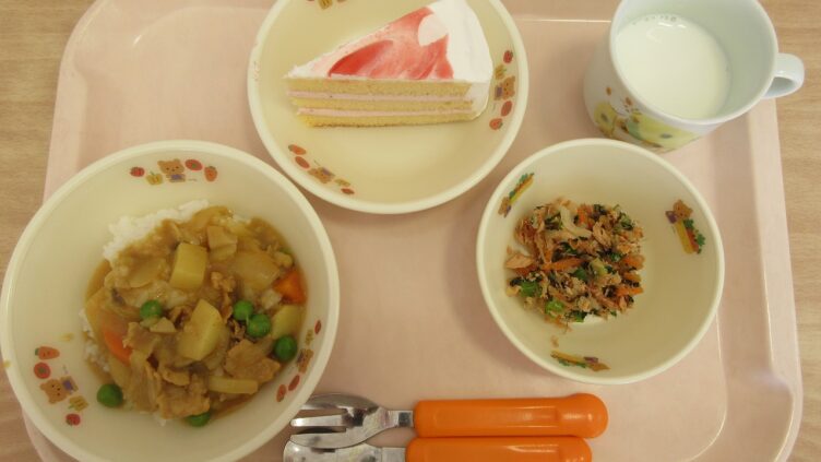 ・カレーライス・小松菜とツナのおかか和え・いちごショートケーキ・牛乳☆クリスマス行事食です☆2歳の提供量です