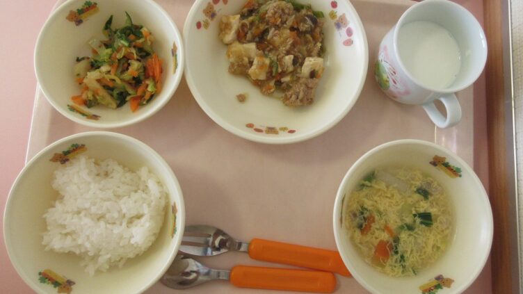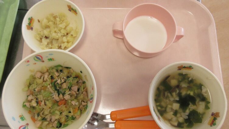 ・てりやき野菜丼・みそ汁・さつま芋の甘煮・牛乳0歳児の提供量です☆